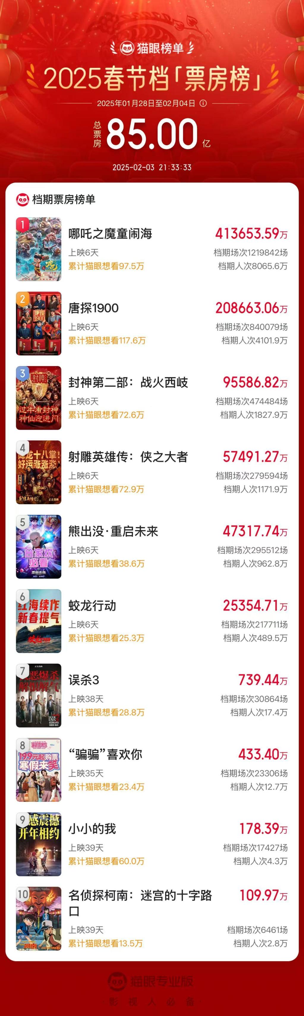 据猫眼专业版数据,2月3日21时33分,2025春节档总票房(含预售)破85亿!《哪吒之魔童闹海》《唐探1900》《封神第二部:战火西岐》分列春节档票房榜前三位。 记者:袁云儿...